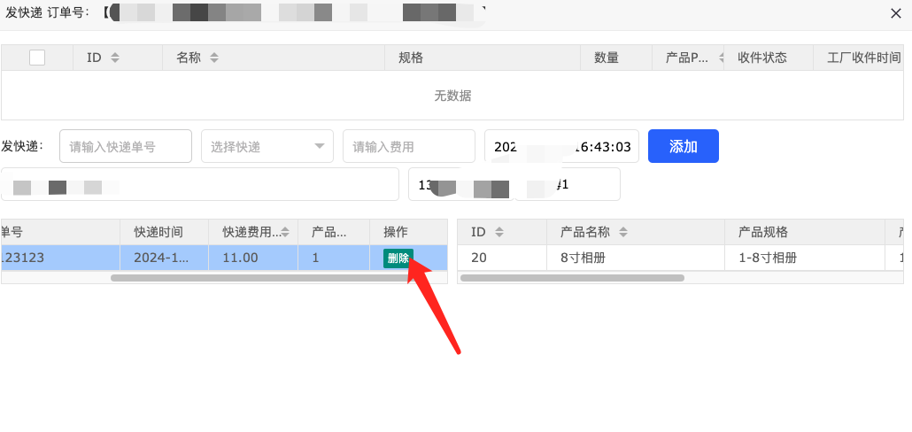 1、如果位置1处显示无数据,说明当前订单没有需要发快递的产品,可能产品已经做过送件,或发过快递了,