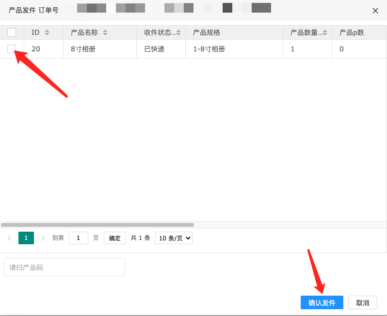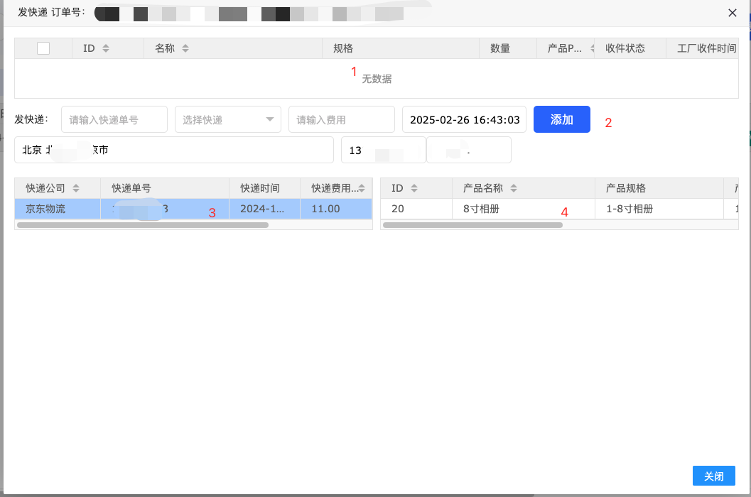 3、发完快递后,在位置3会显示当前订单已发送的快递单,点击选中快递单,在位置4处会显示此快递单包含的产品