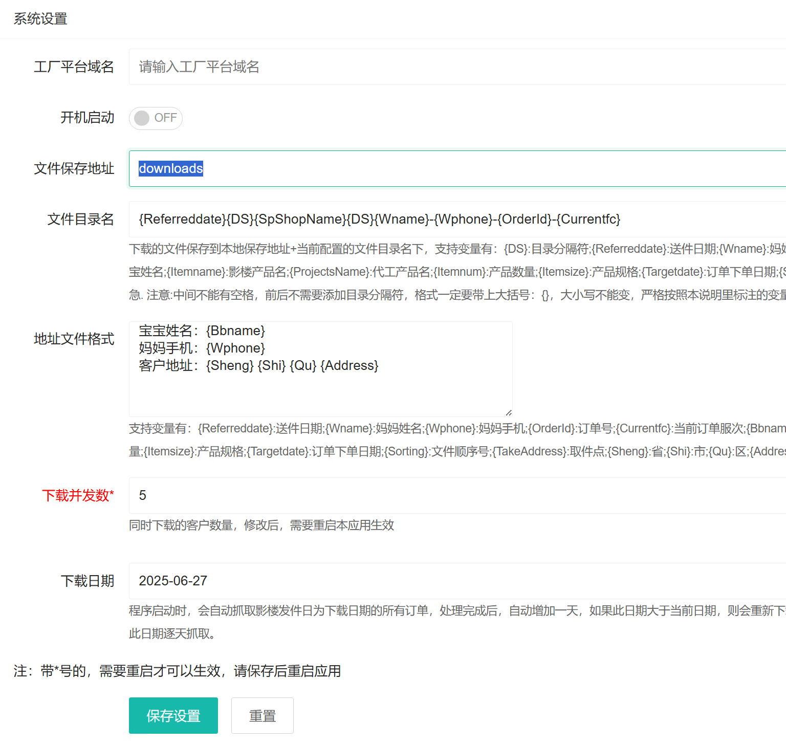 3、必须要设置的只有工厂系统域名,需要配置成当前对接影楼的工厂系统的域名(只输入域名部分即可,如 http://factory.sx.com/ )