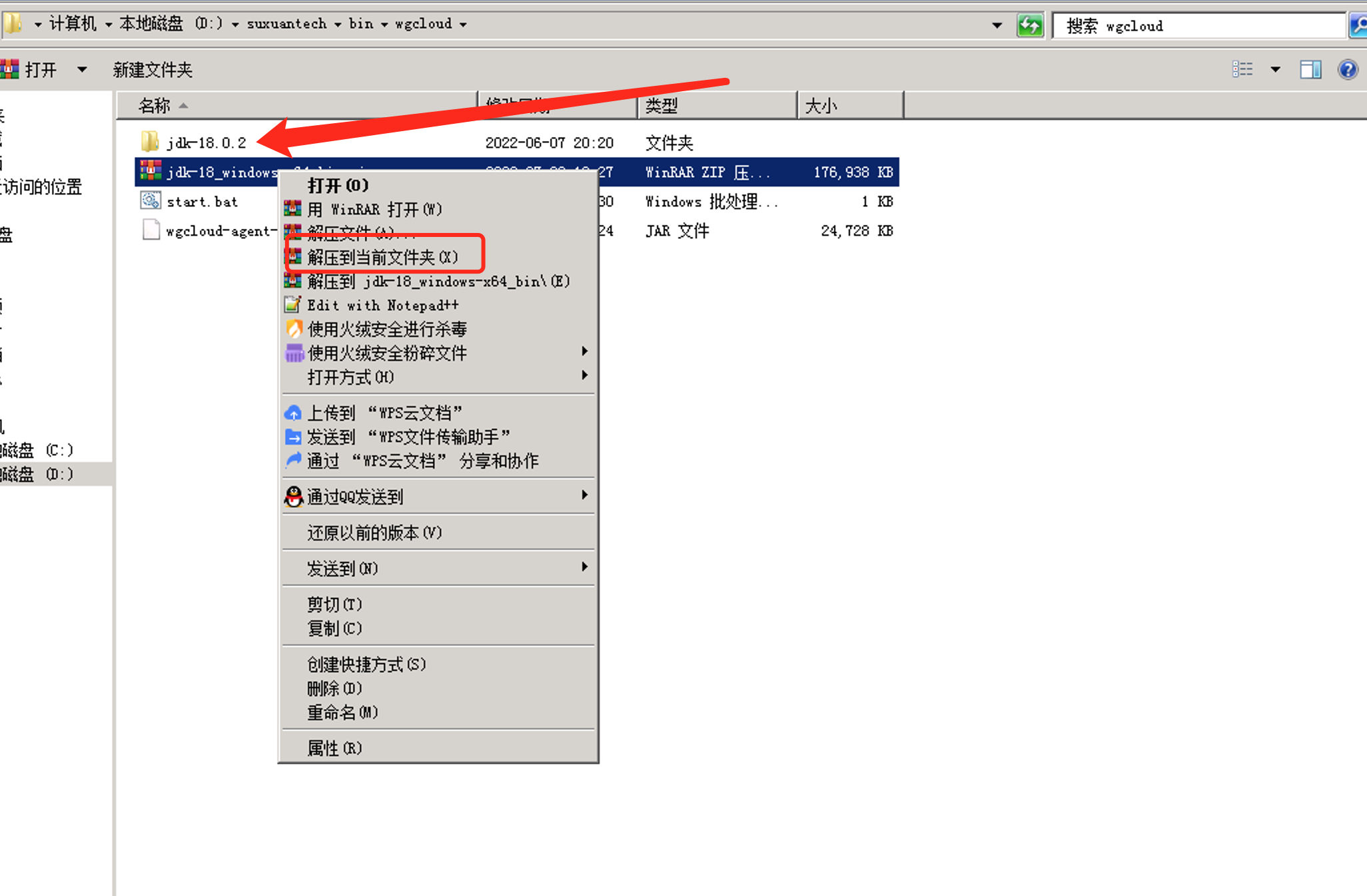 - 进入wgcloud目录,右键jdk-18……tar.gz 选择解压到当前文件夹,当前文件夹会多出一个:jdk-18.0.2的目录