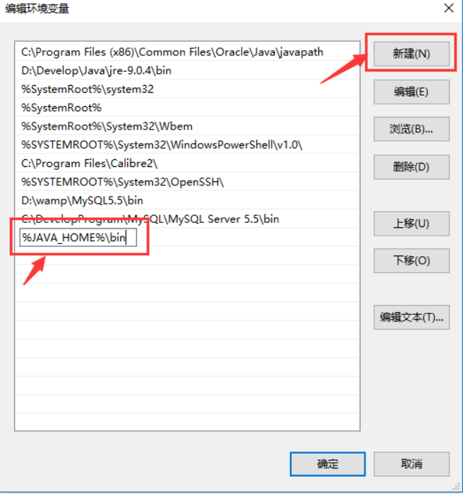 在弹出的“编辑系统变量”框中,点击“新建”,输入%JAVA_HOME%\bin。
