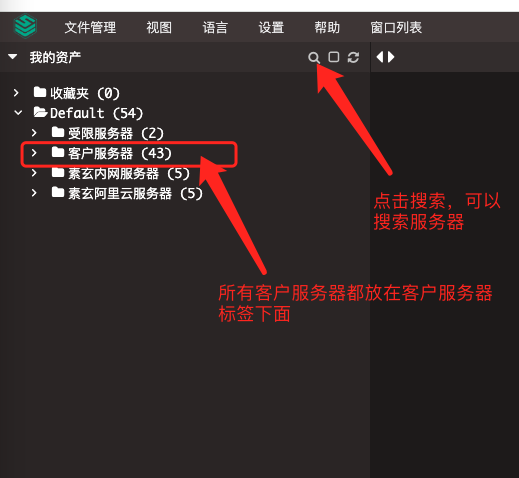 进入web终端后,在左边客户服务器栏目下,就是所有的客户服务器的远程,没找到的,可以点击上方放大镜进行搜索