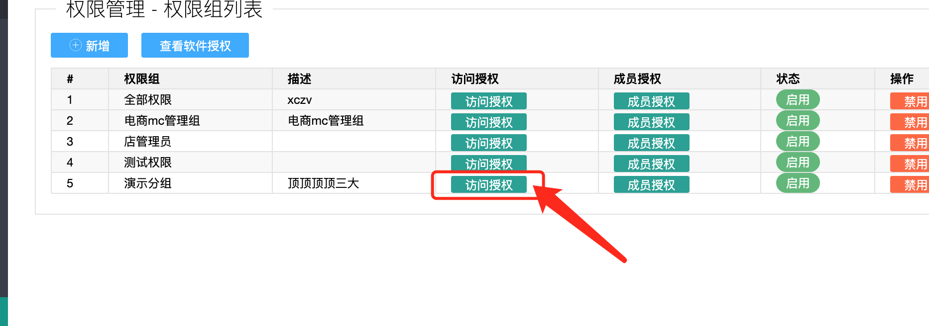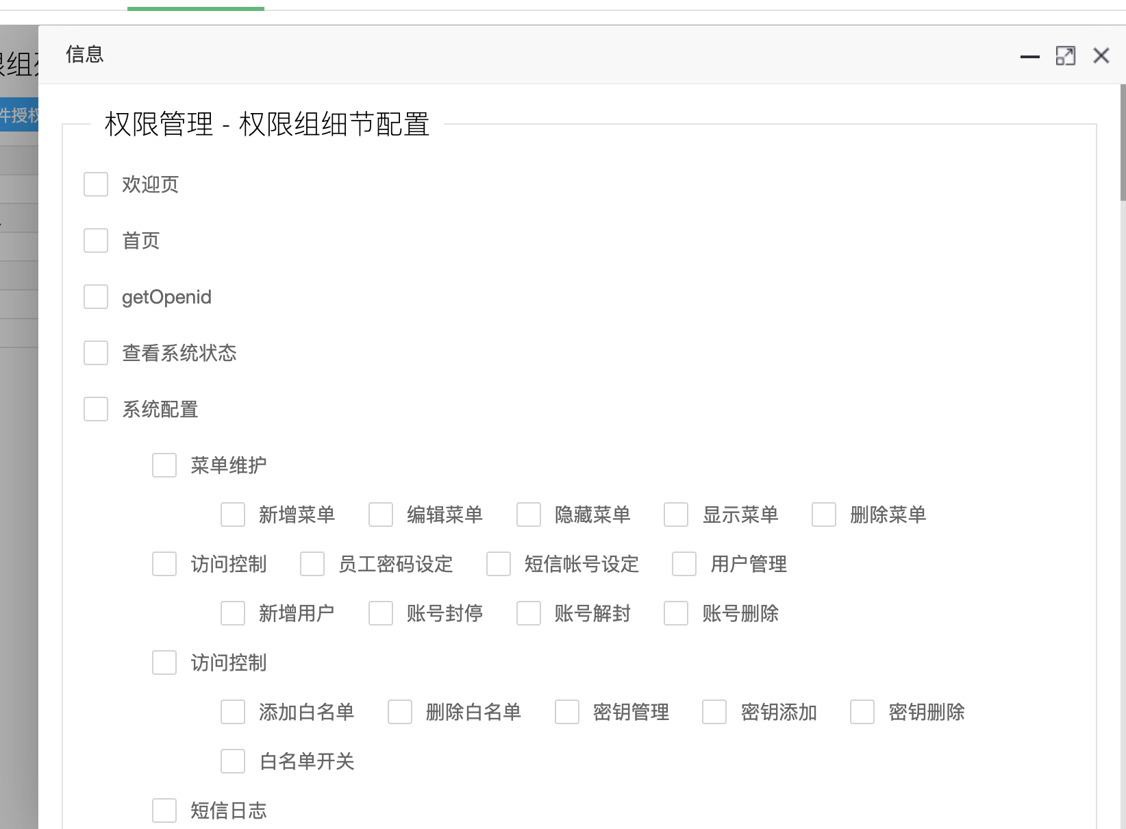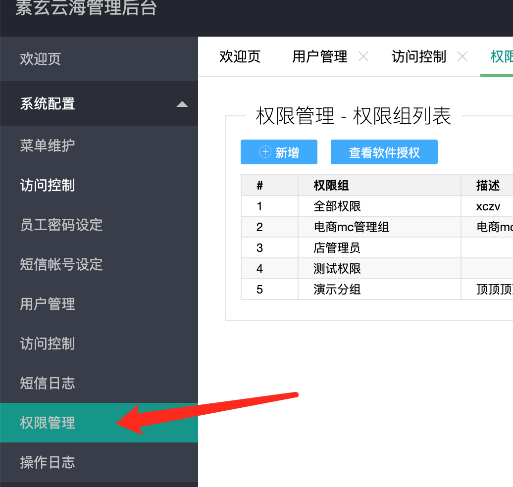 目录 搜索 展开 首页人事资料设定员工导入常见错误员工登录MC产品授权规则用户身份绑定扫码开单配置需求扫码开单页面LOGO更换系统全局设定签名配置订单签名强制关注公众号打开微信服务器通知功能访问控制【白名单】关于客户端出口地址是动态IP的解决方案新版瓜子壳客户端系统配置短信配置短信配置后获取余额返回null模板消息新模板消息配置员工使用我的影像公众号接收消息微信配置配置授权域名MC内置帐号管理帐号管理权限组管理帐号绑定权限组员工帐号操作MC功能权限组管理给岗位绑定权限组 暂无相关搜索结果! 阅读次数:23 本文档使用 MinDoc 发布 权限组管理 登录MC,左侧选择系统配置–>权限管理 在界面上新增一个权限组 其中名称为必填项,表示权限组的名称 保存后,在列表上找到刚刚添加的权限组,然后点击 访问授权 选择这个权限组所能操作的所有权限,保存后,权限组操作完成 作者:宋德美 创建时间:2023-09-02 08:41最后编辑:宋德美 更新时间:2024-06-26 11:56