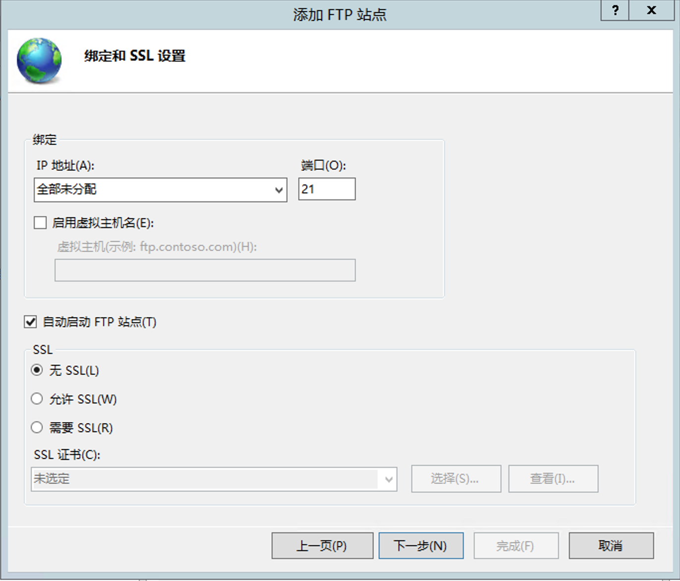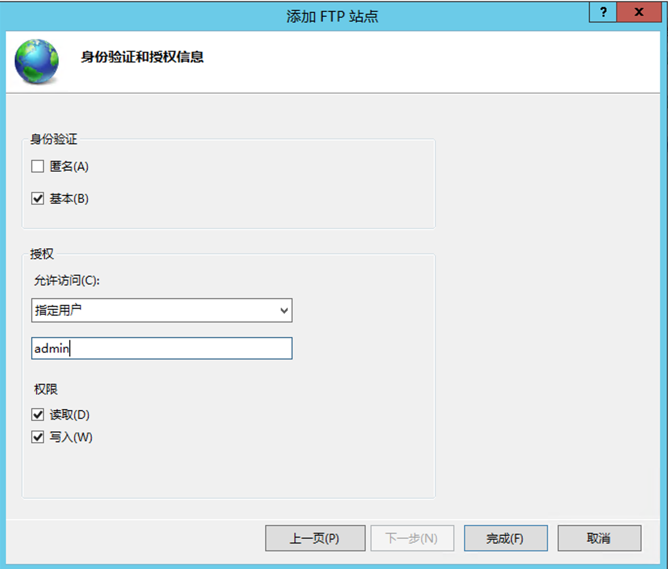 5、在第3步点击下一步后,设置好身份验证为基本,然后充许访问为指定用户,并输入刚才第4步创建的用户名,权限设置为:读取和写入都勾选,如下图,然后点完成。
