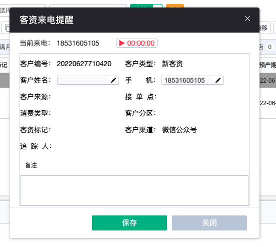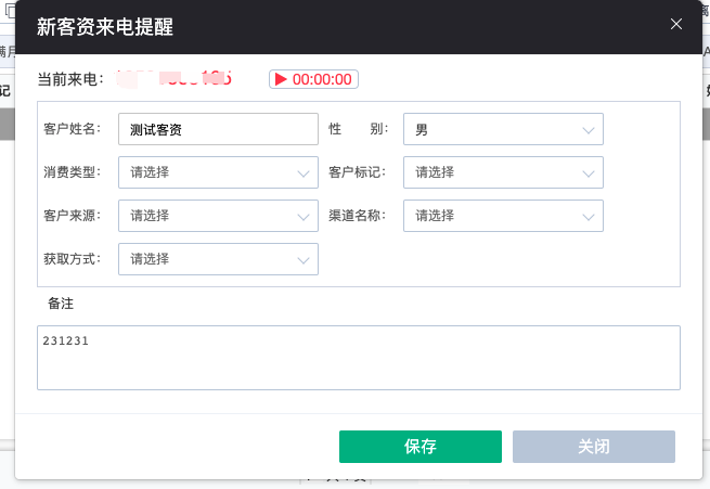 如果有来电,系统会弹出不同类型的弹窗,如果是新客资【CRM内没有此手机号的客资,爸爸(客资手机)或妈妈(配偶手机)都没有】会弹出新客来电 弹窗,如果系统里有这个客资,会弹出老客资来电弹窗,