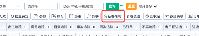 对于新电话来电,系统提供了一个新客来电功能,在客资列表上方操作按钮处,