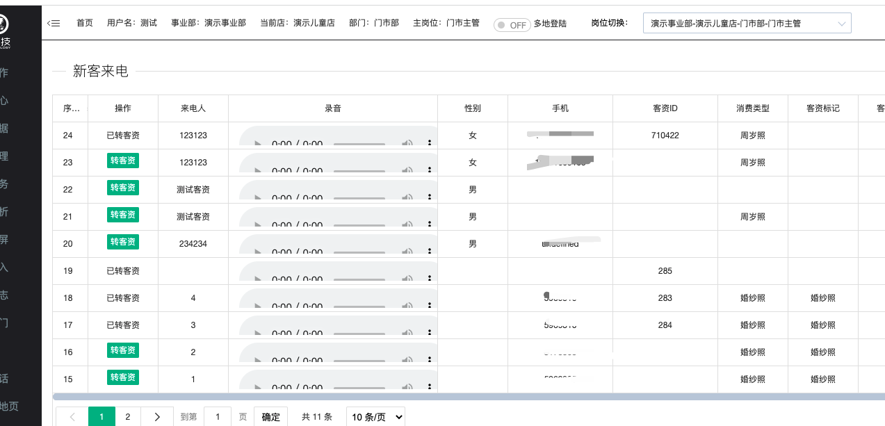 有新客来电权限的人,可以点击进去,系统会有所有来电列表,可在列表将来电转为客资