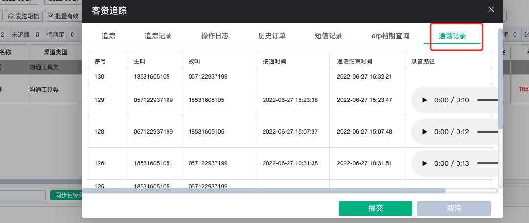 在追踪记录里也会有录音记录,追踪记录里显示的为当前客资的追踪记录,通话记录里显示的为客资的妈妈手机号【儿童】或客户手机号【婚纱】的相关的所有记录,可能并不是当前这笔客资的【一个手机号可能会有多笔客资】