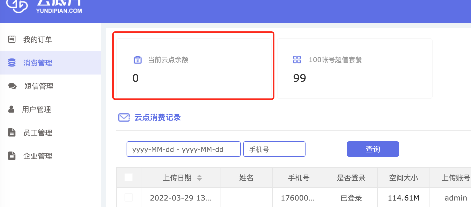 进入商户后台–>消费管理 右侧会有云点余额及套餐余额 云点余额: 套餐余额: 如有多个套餐,则在后面依次排列作者:宋德美 创建时间:2022-03-29 14:14最后编辑:宋德美 更新时间:2025-04-21 10:05