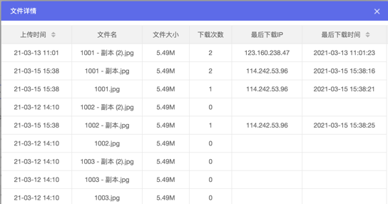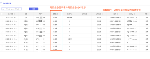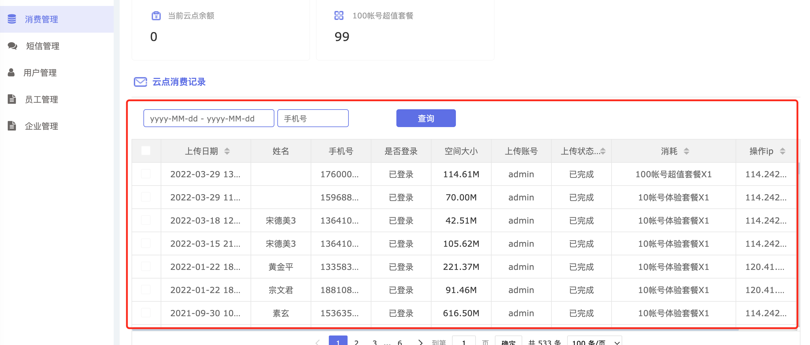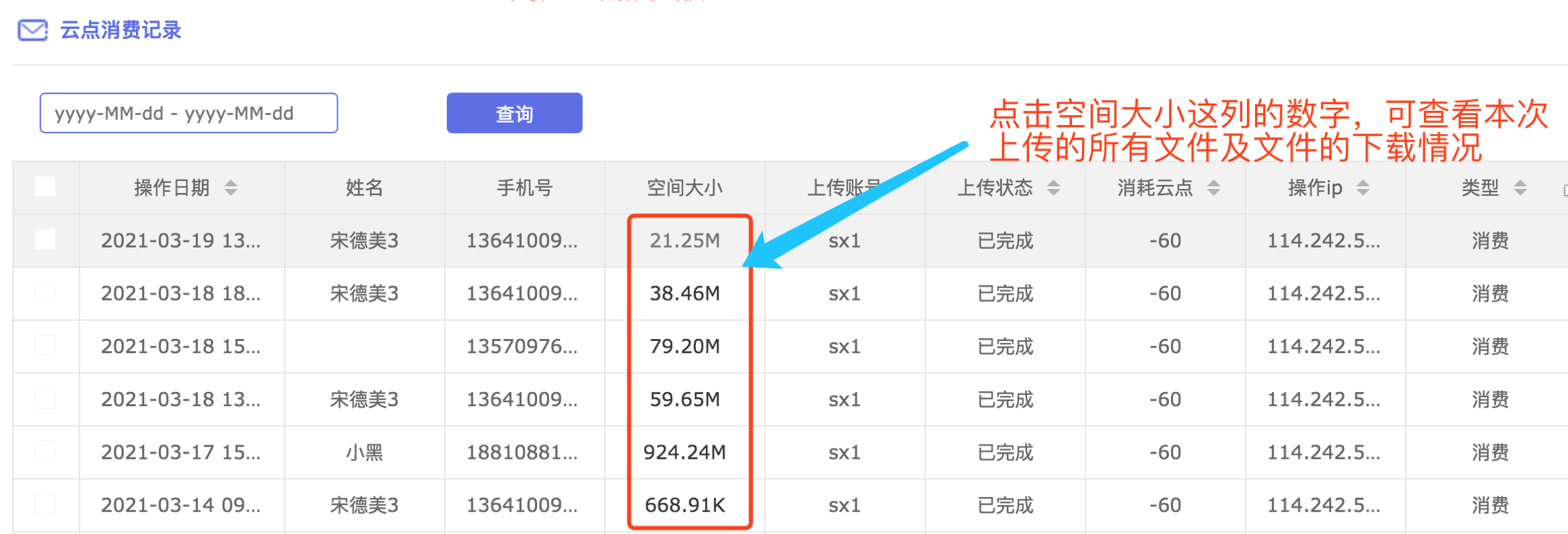 进入商户后台–>消费管理 右侧下方为所有消费记录 在消费栏,会显示扣除的是云点还是套餐。 客户的照片下载记录,可以点击客户后面的空间大小的文字进行查看: 每个文件的下载次数及下载地址时间信息都可以查看: 作者:宋德美 创建时间:2022-03-29 14:26最后编辑:宋德美 更新时间:2025-04-21 10:05