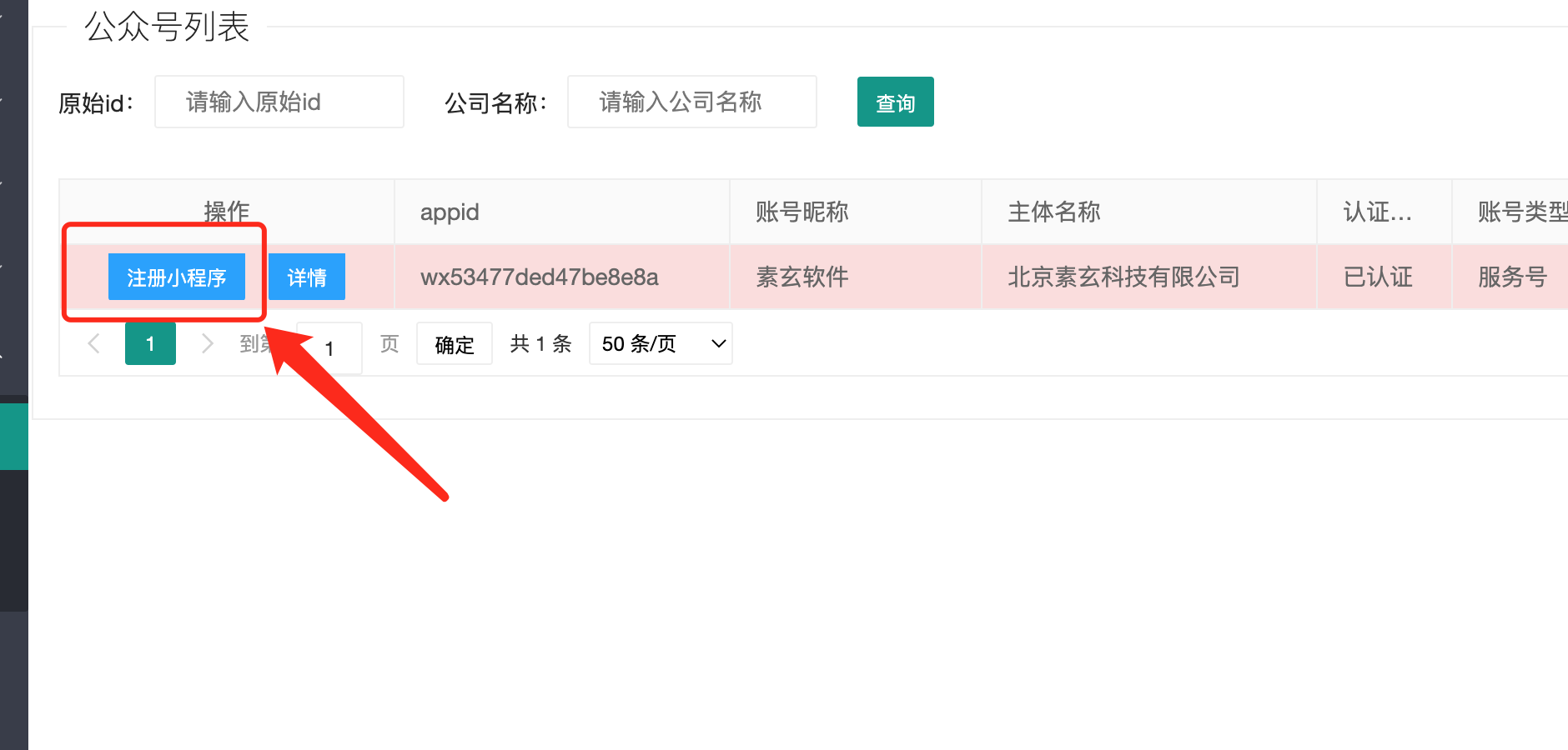 - 在公众号列表内的:操作 列 会有注册小程序 按钮
