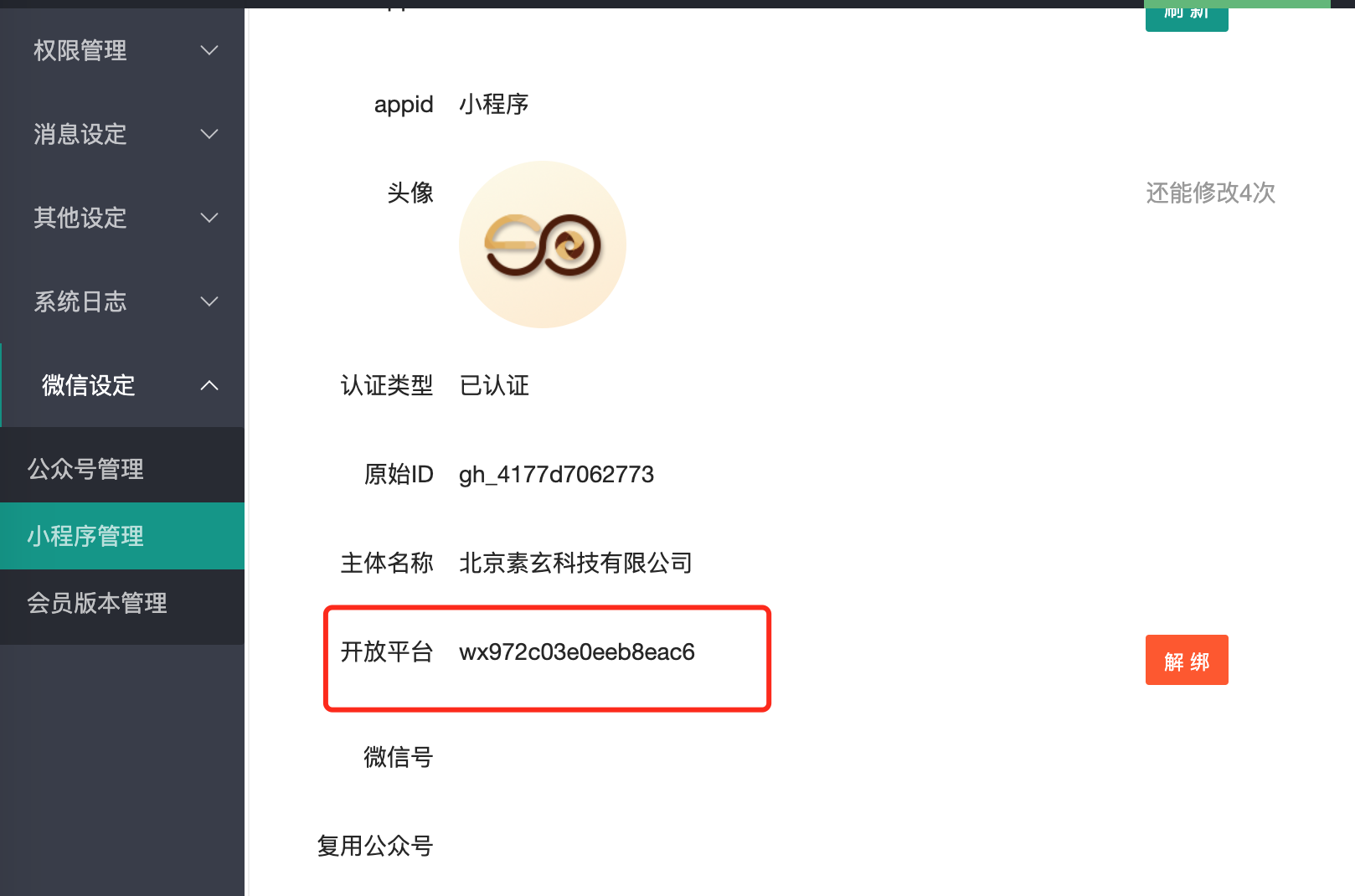 如果小程序的开放平台帐号,与公众号的开放平台帐号不一样,请点击解绑,再重新操作一下绑定,系统会尝试绑定成一样的开放平台