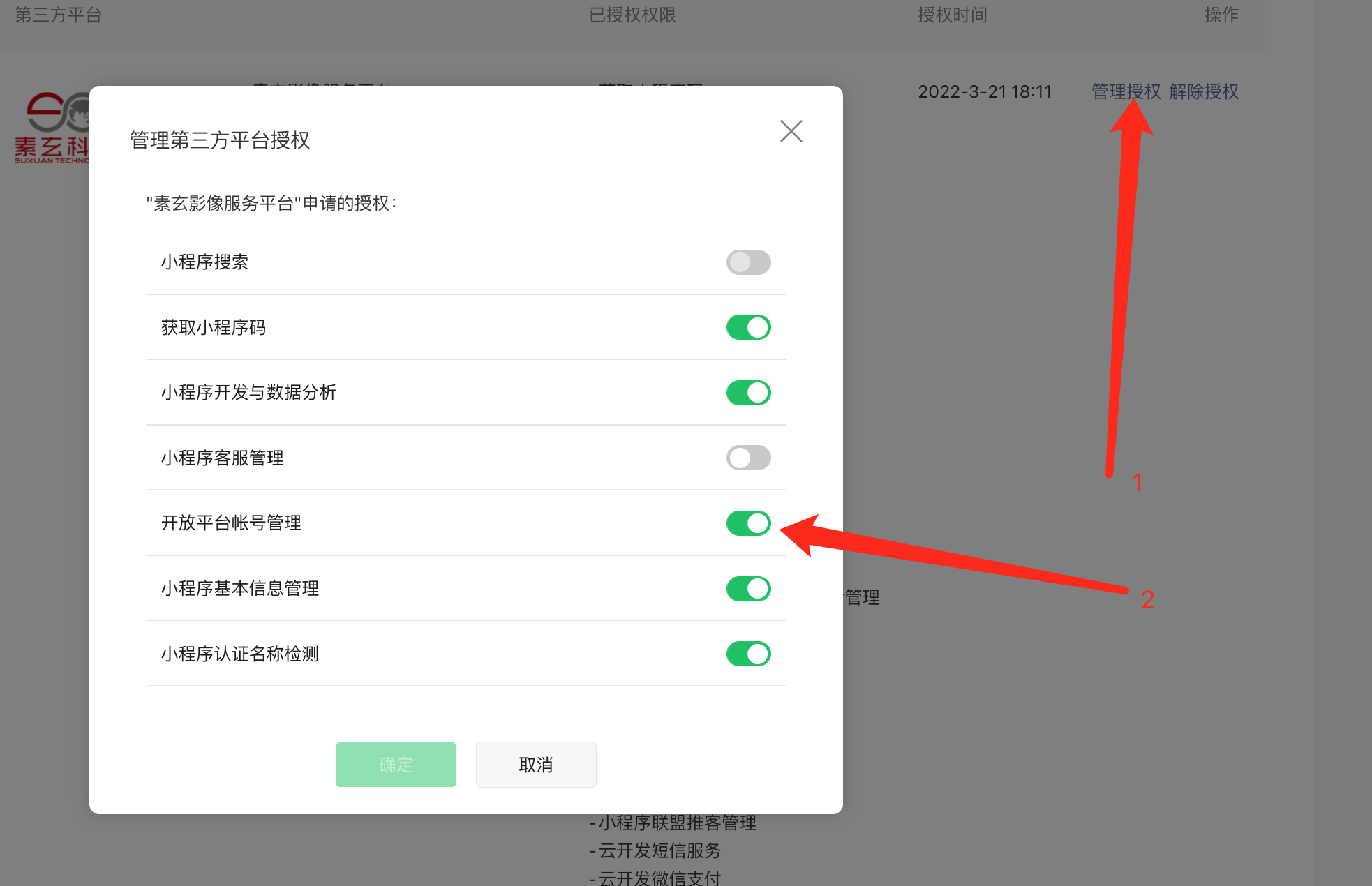 此权限只能授权给一个第三方平台,如是小程序已经把这个权限授权给其他平台了,再授权给天象云时,就没有此权限,需要把其他授权的权限取消掉,重新给素玄影像服务台即可。在后面的管理权限内就可以操作。