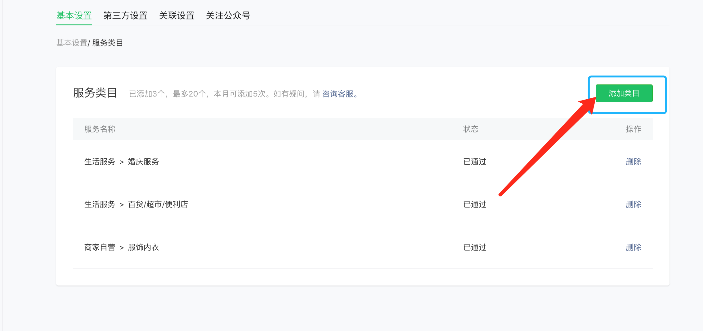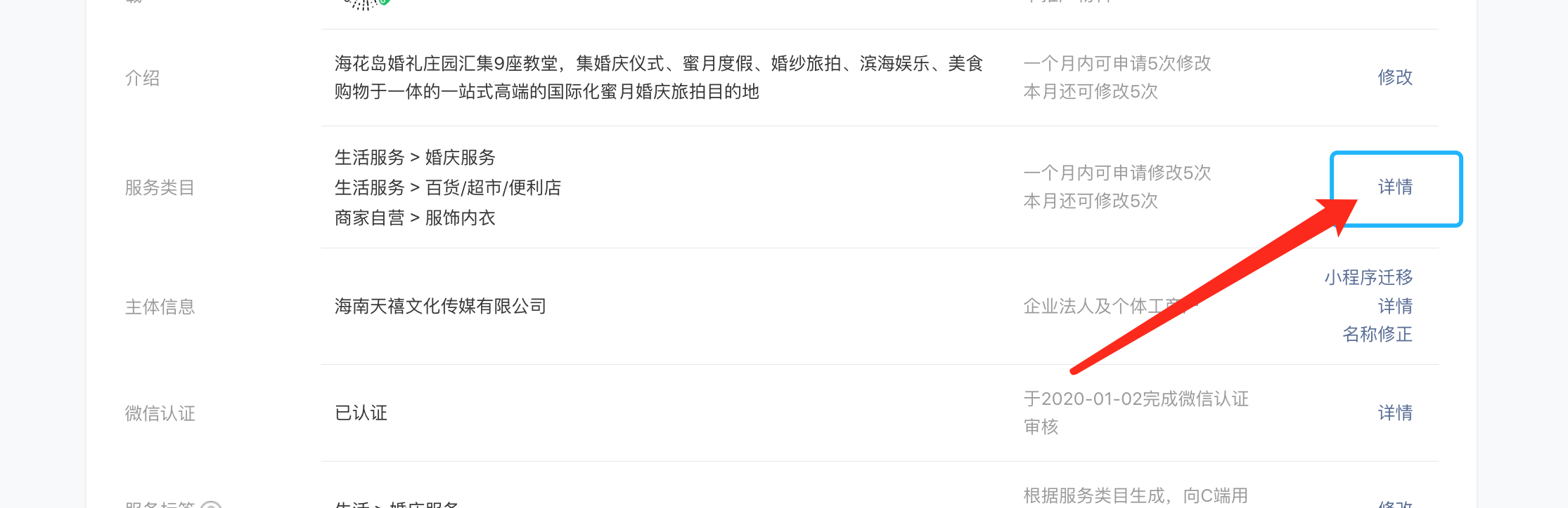 登录小程序后台【如果是在天像云后台使用公众号注册的小程序,参见设置小程序登录邮箱及密码 文档】找到 设置–>基本设置–>服务类目,