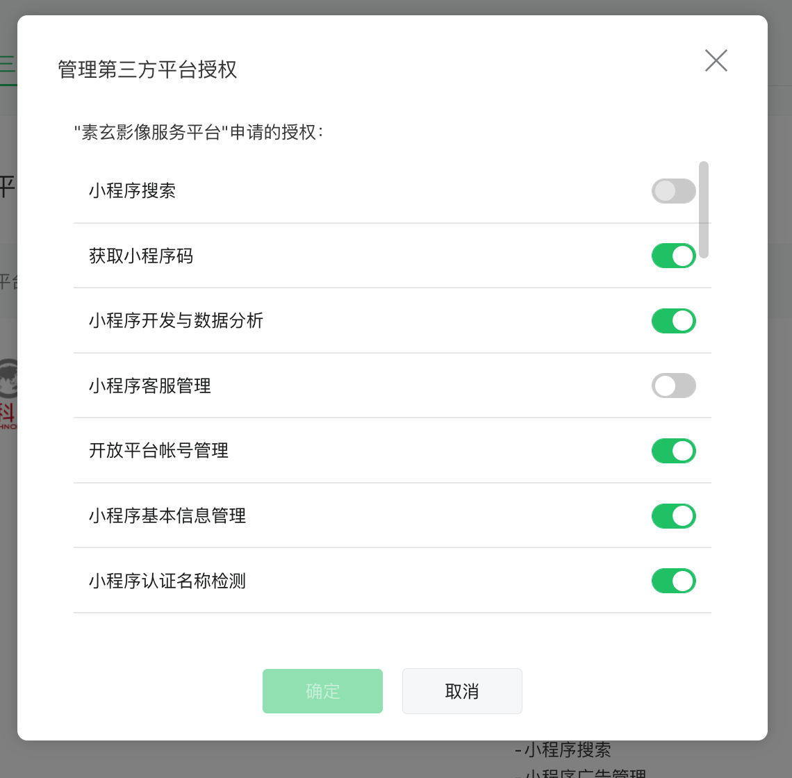 登录后台后,找到:设置–>第三方设置 在第三方平台列表,找到素玄影像服务平台,点击右则的管理权限即可修改已授权的权限,如下图: