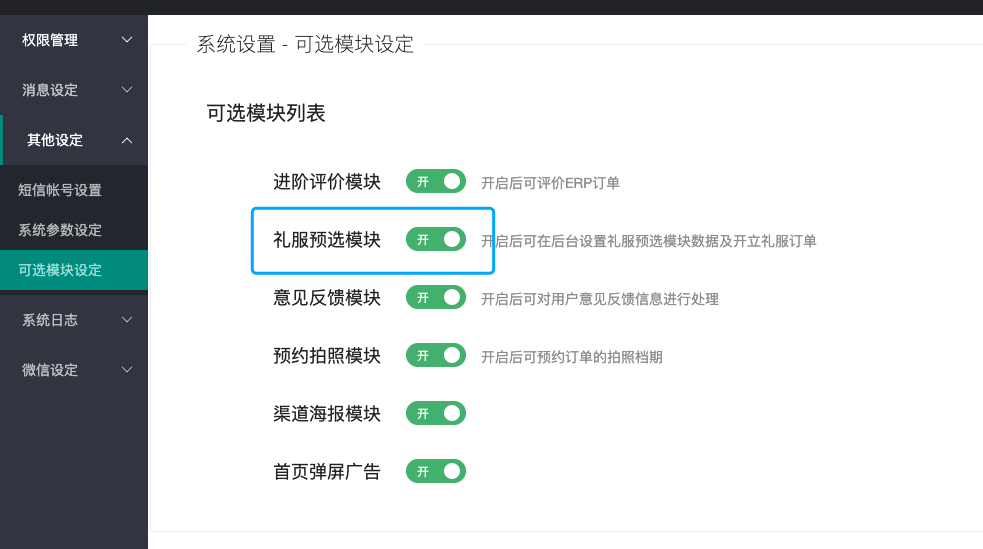进入天象云后台,在系统设置–>其他设定–>可选模块设定内,开启礼服预选模块,如下图: