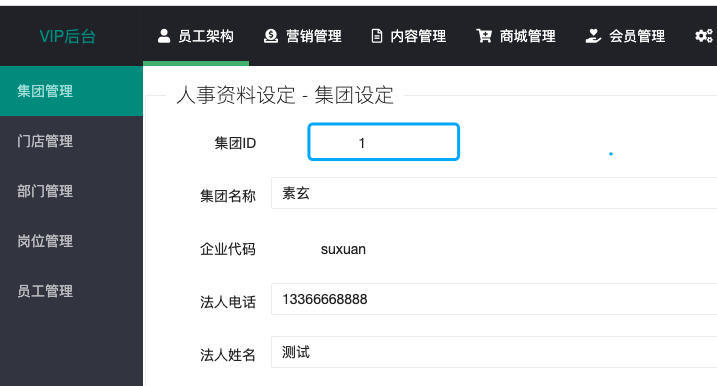 进入天像云后台,在 员工架构-->集团管理内,显示为集团ID后面的数字,为当前企业的集团ID,记录好后面会用到【下图中的1为测试的,要获取您企业的真实的ID】