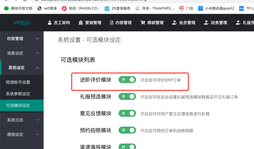 目录 搜索 展开 首页基础管理帐号注册帐号登录组织架构集团配置门店配置部门配置岗位管理权限管理公众号授权及管理授权公众号取消授权绑定开放平台帐号小程序授权及管理公众号快速注册小程序授权已注册好的小程序小程序信息完善使用小程序客服登录小程序后台开通小程序支付设置小程序登录邮箱及密码设置小程序支付信息删除小程序绑定开放平台帐号申请开通地理位置权限修改小程序授权信息小程序缺少权限的排查及处理小程序升级绑定公众号菜单小程序订单中心路径设置常见问题上传代码提示上传失败新会员系统内容管理位置内容营销管理活动管理活动列表报名列表优惠券转介绍管理首页活动弹屏广告会员管理会员列表会员机制底片下载商城管理评价管理整体流程入口设置开启评价评价设定商品管理商品列表商品分类云确版入口设置礼服预选入口设置ERP订单自助扫码开单礼服预选结果全局配置后台操作说明礼服分类礼服等级礼服设定礼服订单自助扫码开单吾优云帐号管理商户注册帐号审核客人帐号订单管理充值管理计费方式消费管理帐户余额消费记录上传客户管理已上传客户列表删除底片修改密码上传管理创建帐号发送微信消息新上传服务下载管理公众号入口配置windows客户端平台MAC平台网页下载到期提醒企微微信简介后端管理授权企业微信员工帐号开通消息群发朋友圈群发获客二维码标签管理作战包管理授权小程序到企微聊天工具栏使用工具栏配置帐号登录关联客户手机号客户基本信息客户标签关联非当前手机号订单开立新单客户排档快递查询电访一键建群常见问题帐号无法登录主体问题附件文档 暂无相关搜索结果! 阅读次数:92 本文档使用 MinDoc 发布 开启评价 天象云后台开启位置: 系统设置–> 其他设定–>可选模块设定 将 进阶评价模块 打开 即可使用会员评价功能。【本功能暂时只针对使用素玄ERP的客户有效,非素玄ERP客户需要进行收费对接后,才可使用】 如下图: 作者:宋德美 创建时间:2022-07-21 11:23最后编辑:宋德美 更新时间:2025-04-21 10:05 提交评论