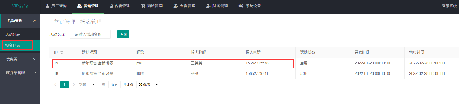 查看报名活动的报名情况操作:营销管理-活动管理-报名列表查看报名类活动的报名明细 可按照活动名称查询 前台报名 后台显示作者:姜晓燕 创建时间:2022-07-22 13:56最后编辑:姜晓燕 更新时间:2025-04-21 10:05