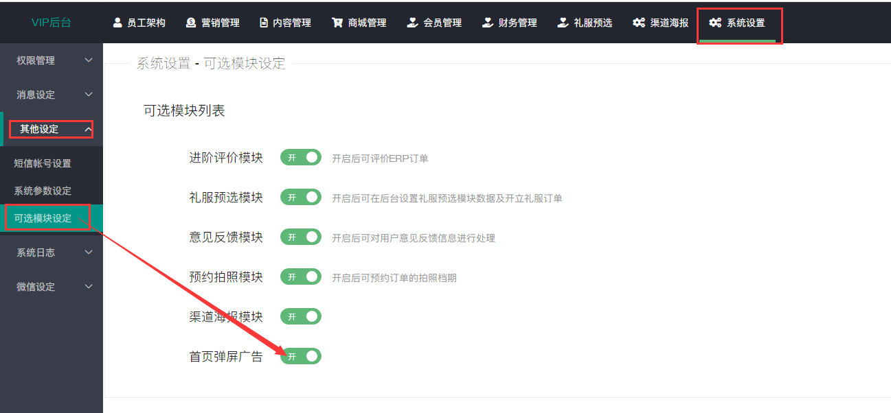 系统设置 ——> 其他设定 ——> 可选模块设定 ——> 首页弹屏广告 开启状态