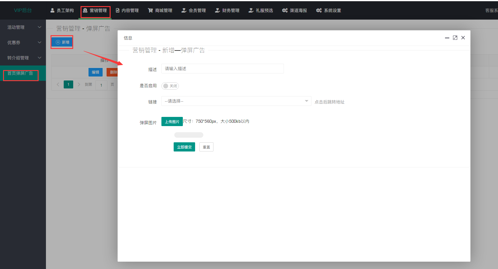 营销管理 ——> 首页弹屏广告 ——> 新增