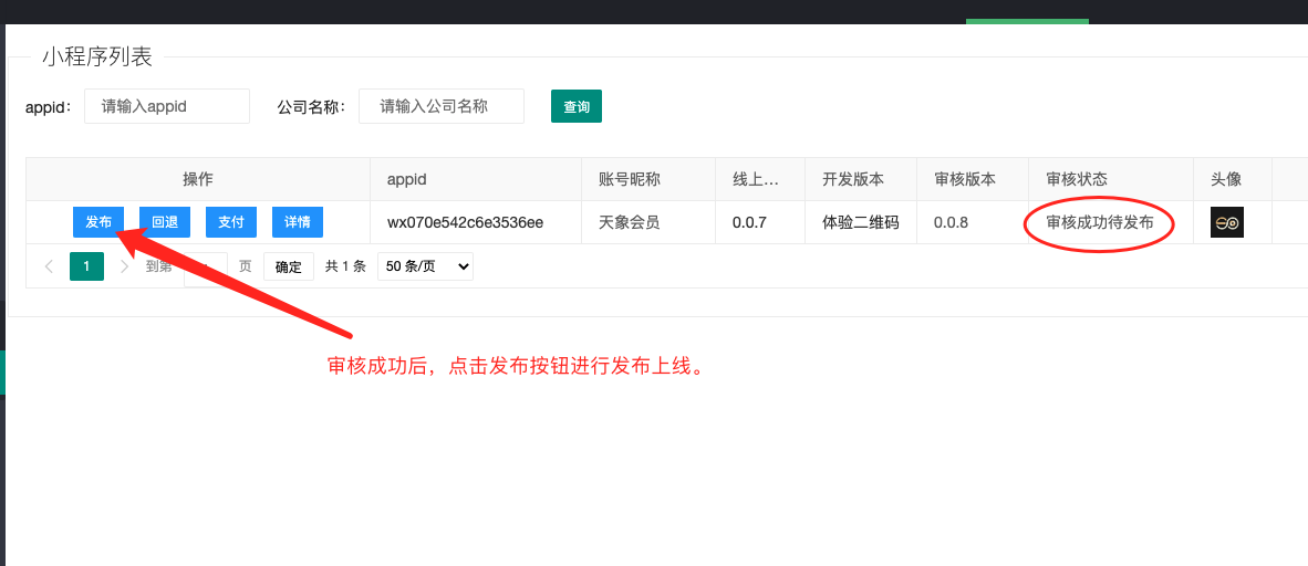 5.这时,在列表页,会显示审核中,待待审核 完成后,在当前列表点击发布即可。