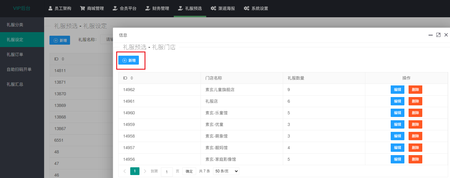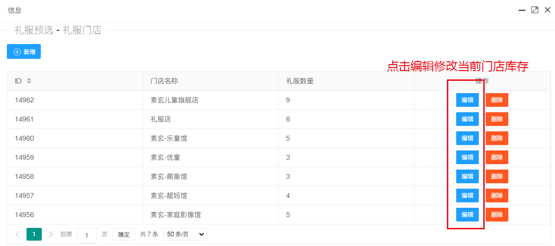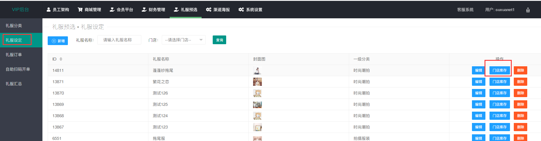 在该礼服编辑提交后 如果想修改礼服库存 可以点击“门店库存-编辑”按门店进行库存修改增加新店库存