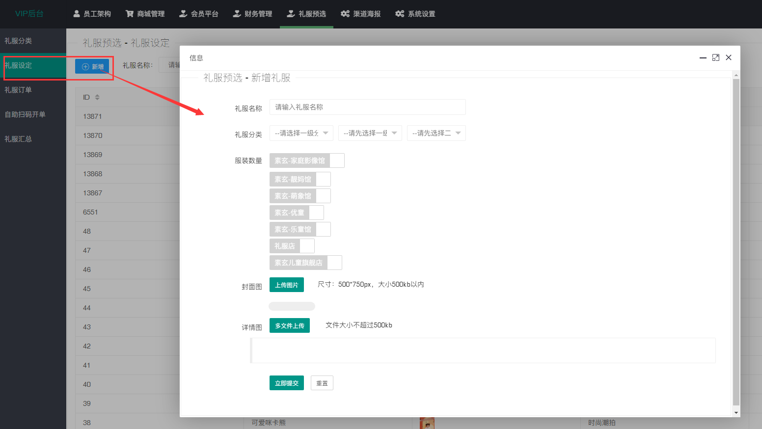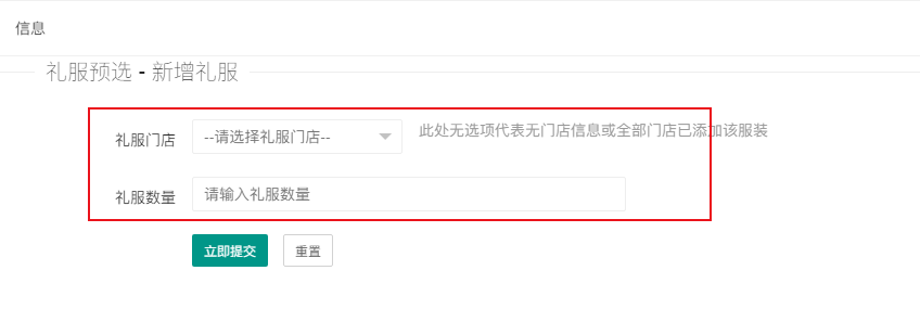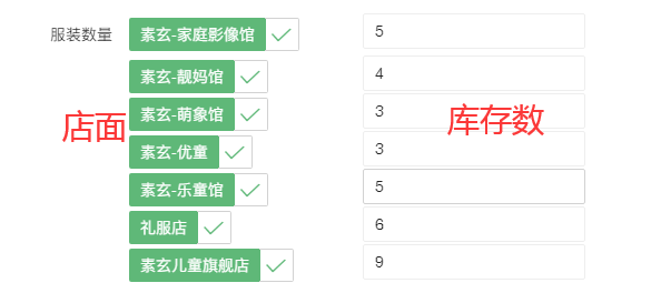 - 礼服数量 选择礼服所属店面(可多选) 并填写好在该店面的库存数量 如图示