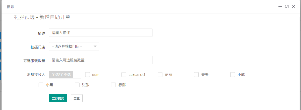 应用于爱婴上门组,给每个上门小组生成一个服装主题预选二维码,上门组和客户确定了上门时间后,可以把二维码发给客户,客户自主填写并挑选服装,挑选完后系统会后台自动通知上门组按客户挑选记录准备服装,带着上门。