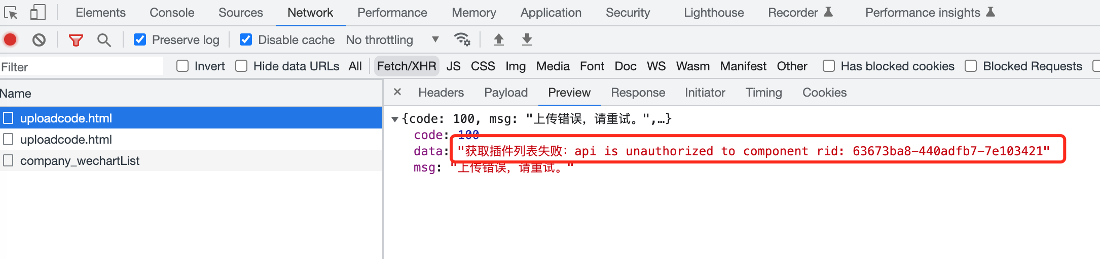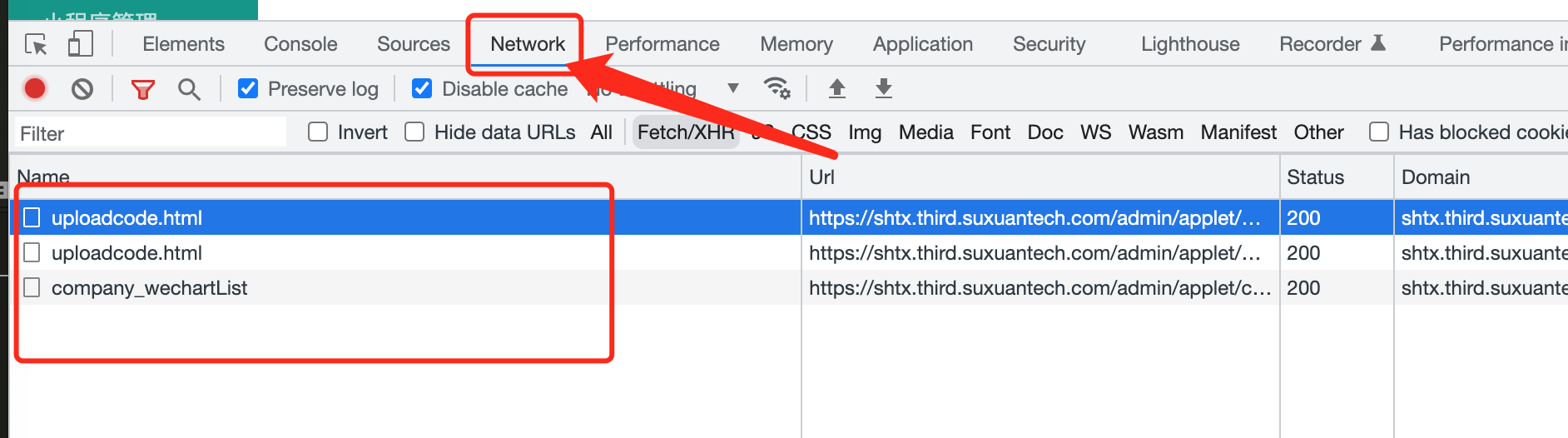 三、小程序授权不足,此情况比较少见,但也有,当上传代码时,提示失败,这时可以按下F12,打开开发者工具,在开发者工具里,打开network页,显示如下界面:
