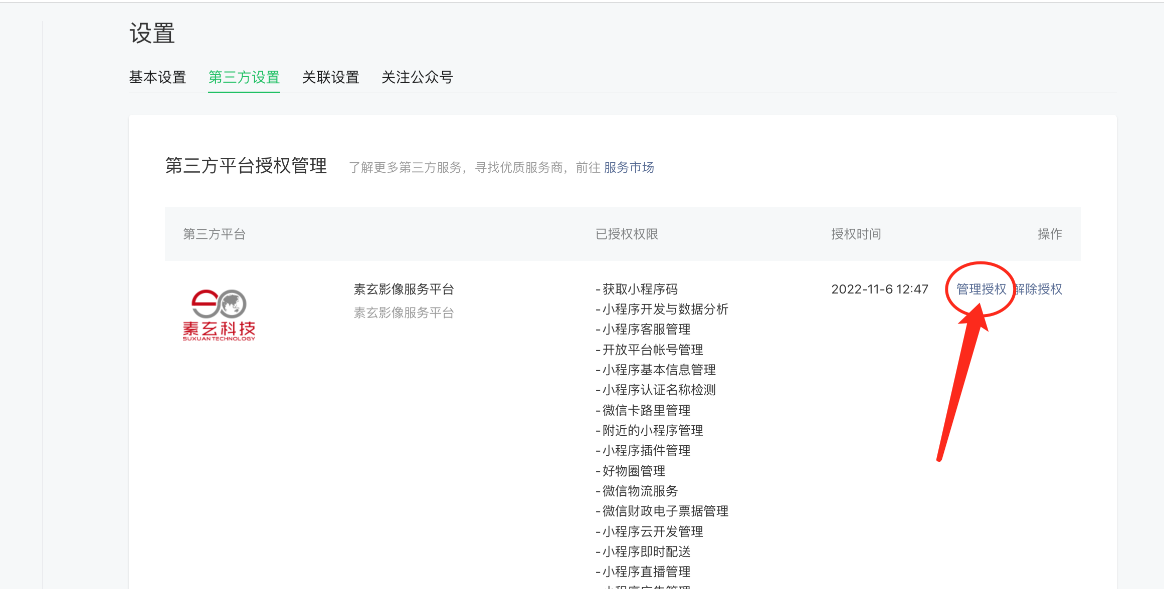 4.点击 “素玄影像服务平台” 右侧的“管理授权”链接