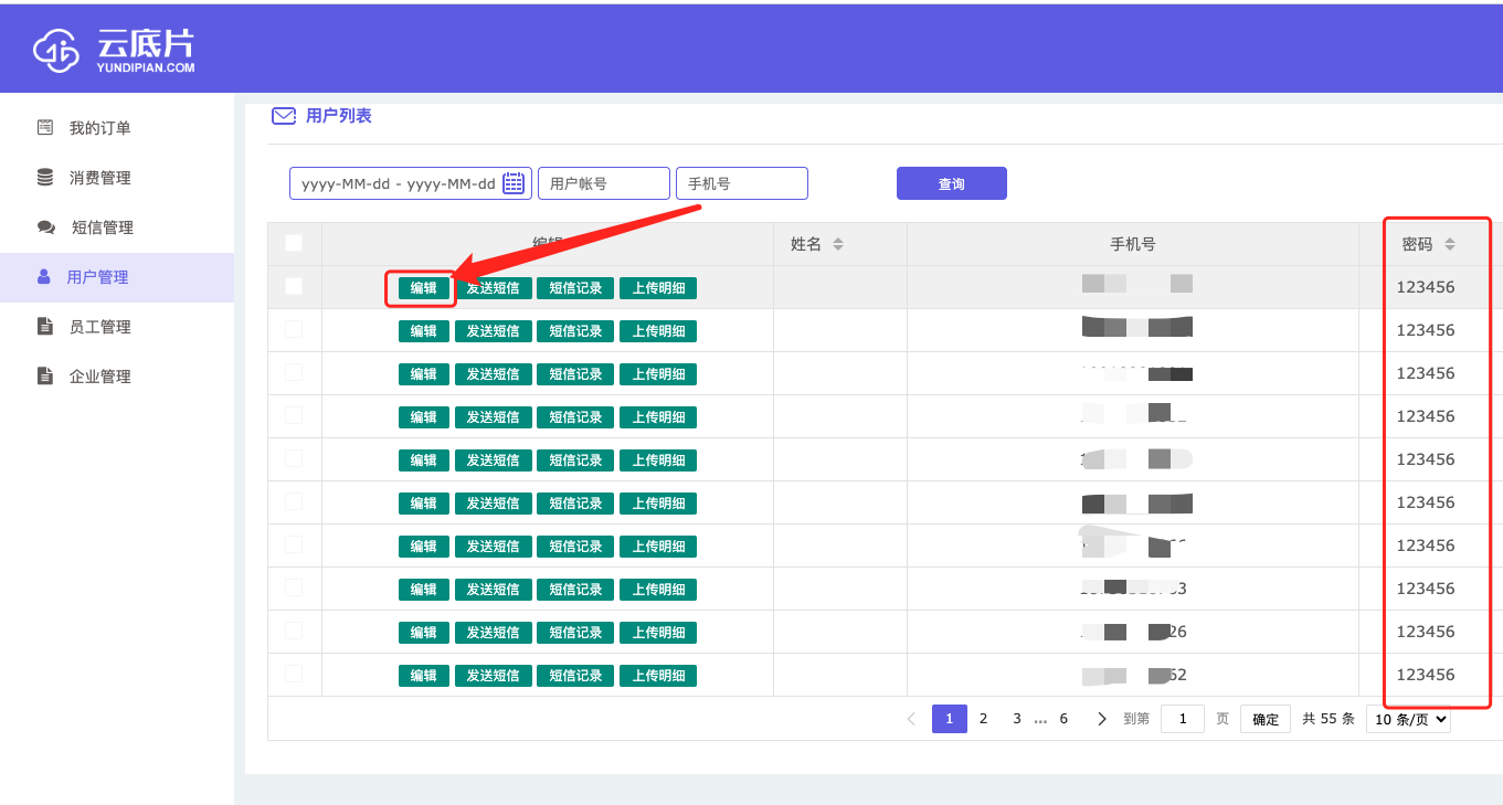 如果用户密码短信丢失,可以登录云底片后台进入用户管理内,有两种方式获取密码: 1、列表页可以直接看到密码2、点击编辑,可以重置此用户的密码 作者:宋德美 创建时间:2023-09-28 14:21最后编辑:宋德美 更新时间:2025-04-21 10:05