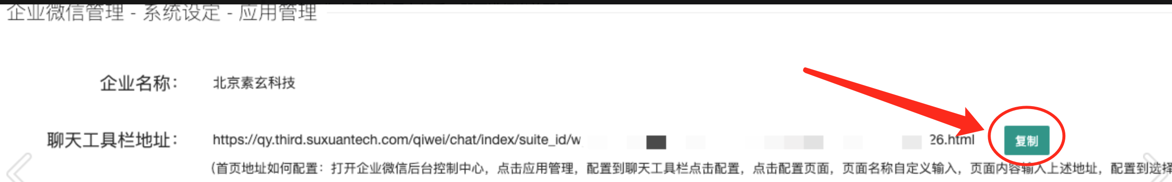 - 扫码授权后,在天象云的企业微信管理–>系统设置–>应用列表 里,会显示应用的工具栏地址和应用主页地址,需要将应用主页地址复制,发给素玄的工作人员进行上架工作