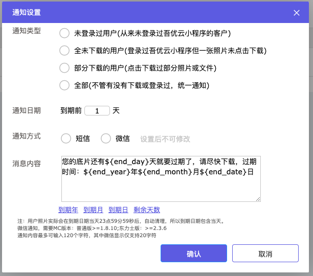 短信或微信,如果是微信通知,需要在MC里设置云底片回调通知接口,本质上,还是调用MC给客户发通知,公众号配置在MC里,使用客户微信公众号进行模板消息推送。