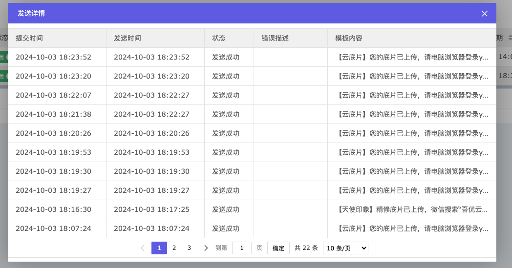 如果是短信,当前云底片帐号必须启用短信,且必须有已经审批过的签名,详见短信管理里相关设置